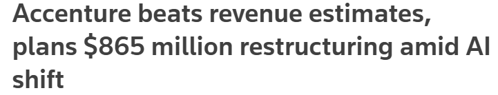 Accenture beat earnings today, then turned around and told 700,000 employees, “Congrats, some of you are about to be recycled in the name of juicing margins.” In short, the Dublin-based consulting behemoth announced a six-month, $865M restructuring program… which means a guillotine of severance checks, selective asset dumps, and a wholesale purge of anyone with skills deemed “nonviable.” In their place will come AI, retraining, and a new “talent strategy” that basically boils down to: adapt, or watch your badge stop working.