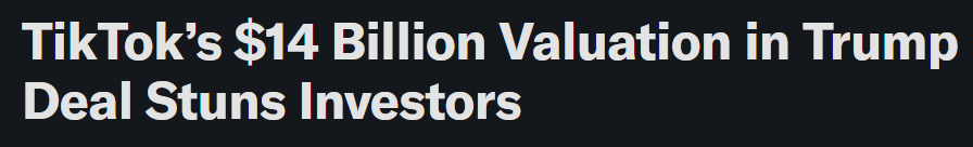 Yesterday, Vice President JD Vance sent everyone’s jaws to the floor when he said (on live tv) Trump’s TikTok deal would peg the app’s U.S. operations at around $14 billion. That number was so low investors had to check if he was reading a Babylon Bee headline… like, did he mean $40B? $100B? Nope. Just $14B.