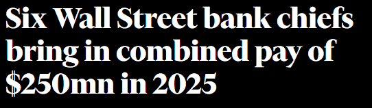 In short, every CEO at the six largest U.S. banks just pulled down $40 million or more in annual compensation. (I’m not crying, you’re crying). Goldman Sachs' David Solomon led the pack at $47 million. Morgan Stanley's Ted Pick grabbed $45 million. Citi's Jane Fraser took home $42 million… plus a $25 million retention bonus in October, because apparently regular eight-figure pay isn't retentive enough. Oh, and Jamie Diamond Hands snagged $43 million while Bank of America’s Brian Moynihan capped $41 million (up 17% YoY). For all you peeps who don’t have calculators… that’s a combined haul north of $250 million for the six of them. Average raise being 22%. Woof.