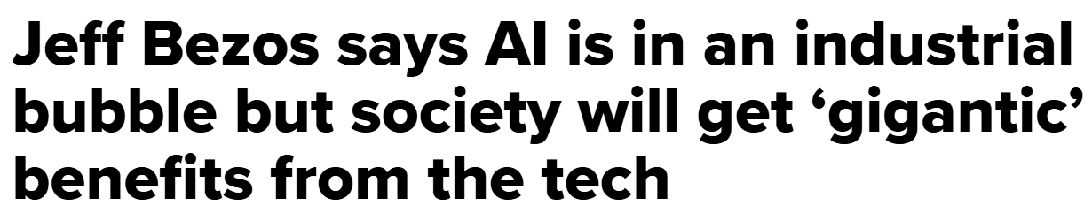 But then Jeff put it in reverse like Terry (probably after his PR handler gave him the universal “cut it” hand signal). Turns out, bubbles aren’t all bad. They make everyone overbuild like crazy, and when the smoke clears, the few survivors are usually monsters. He pointed back to the biotech bubble of the ’90s… most of those labs went belly-up, but the ones that lived ended up curing diseases. Bezos’ bet? AI plays out the same way. Most startups will burn through VC cash like it’s kindling, but the winners will be massive… driving productivity, quality, and who knows, maybe even inventing an AI that answers customer service calls in less than 45 minutes (we can only hope).
