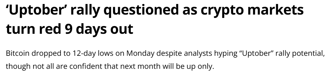 And that brings us to the bigger question: can Uptober actually deliver? October has saved Bitcoin in 10 of the last 12 years, and with the Fed likely to toss in another rate cut, the liquidity train should, on paper, keep rolling. But if that combo can’t light a fire under prices, it points to something deeper… maybe the whole narrative of Wall Street whales piling into Bitcoin and Ether was more smoke than substance. Or maybe they’ve quietly abandoned that trade for now. Either way, if Uptober falls flat, forget about seasonality failing… it’ll be a sign that the “up only” story investors have been telling themselves is losing its grip. And I’m not sure all the crypto bros I know are ready for that.