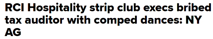 But alas, it obviously worked. Over 14 years, RCI dodged more than $8M in NYC and state taxes, all tied to their “Dance Dollar” racket (customers swapping cash for funny money to redeem for private dances). By my rough math, they shelled out maybe six figures in bribes to erase eight figures in taxes. Bigly.