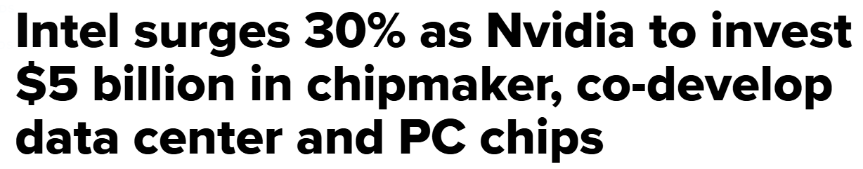 And just like that, Nvidia’s taking a 4%+ stake at $23.28 a share to co-develop PC and data center chips with Intel. You know, the same Intel that (other than its recent marriage to the US government) has been disappointing it’s shareholders for more than a decade, losing ground to AMD, TSMC, and basically anyone with a functioning foundry.