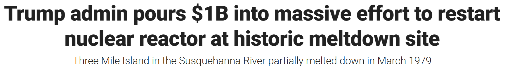 On Tuesday, the administration dropped a fat $1 billion loan on Constellation Energy to reboot the reactor formerly known as Three Mile Island Unit 1. Yes, that Three Mile Island. The one my neighbor Tim literally used as an excuse for why his hairline “suddenly changed direction.”