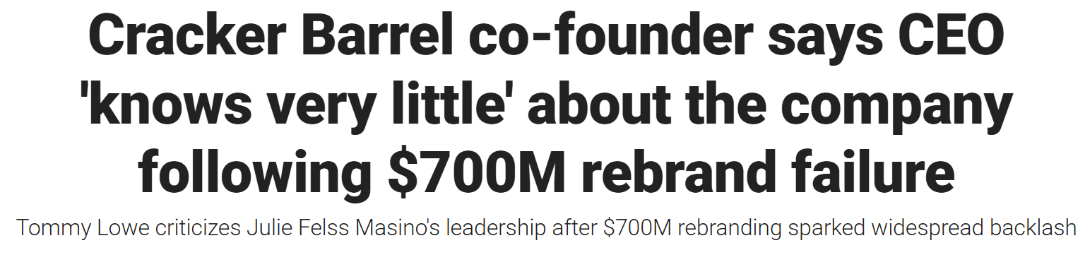 But just as Julie thought she’d finally gotten this monkey off her back… another one (in the form of a very outspoken old man) jumped right on. 93-year-old Cracker Barrel co-founder Tommy Lowe broke his silence and immediately went scorched earth on current CEO Julie Masino (formerly of Taco Bell and Mattel) calling the entire overhaul “the biggest waste of money in the world.”