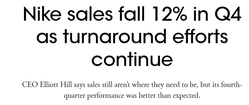 Now apparently, the shift isn’t happening because the marketing team got bored… it’s because Nike is in what they politely call a “transition year.” In my view, it sure seems like another way of saying… “Please don’t look too closely at the numbers while we attempt to get this baby back to the glory days.” For instance, in their last earnings report… sales dropped 12% to $11.1B, and the company announced layoffs for about 1% of corporate staff (always a great way to boost morale).