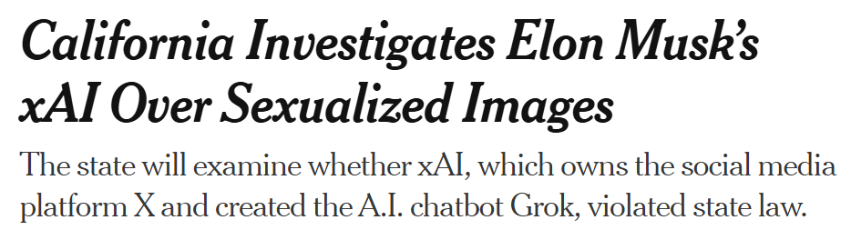 Attorney General Rob Bonta announced his office is investigating xAI, citing what he described as mass production of nonconsensual, sexually explicit deepfake images. In other words, this wasn’t a few weirdos… this was bad behavior going fully industrial (OSHA would not approve).