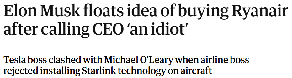 Over the holiday weekend, Elon Musk decided that the real problem facing global aviation wasn’t fuel prices, labor shortages, or Boeing bolts falling off mid-flight… it was Michael O’Leary still having a job. (No, he’s not related to Mr. Wonderful… I checked).