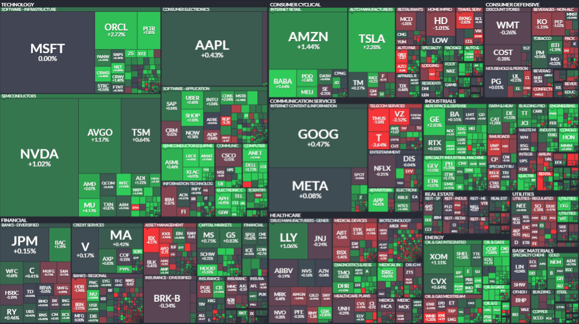 The S&P 500 rose 0.7%, the Dow added 0.4%, and the Nasdaq took off (+1%) thanks to a tech-heavy rebound powered by the usual household names: Nvidia, Broadcom, Amazon, and even Oracle, which jumped 3%.