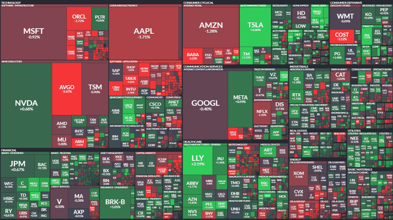 As for today’s price action, AI fears were officially back on the menu. The S&P 500 slipped about 0.2%, the Dow sagged roughly 0.2%, and the Nasdaq took the hardest punch, sliding around 0.5%. Broadcom got kicked square in the teeth, down more than 5%, while Oracle followed it down the stairs, off over 2%.