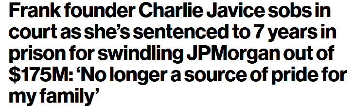 But alas, Charlie Javice is going away. She’s not Elizabeth Holmes, she’s not SBF, she’s not even Adam Neumann… he’s the B-list scammer who conned a trillion-dollar bank into paying Ferrari prices for a used Honda Civic with forged paperwork. Which to be fair, is kind of genius. Until next time, friends…