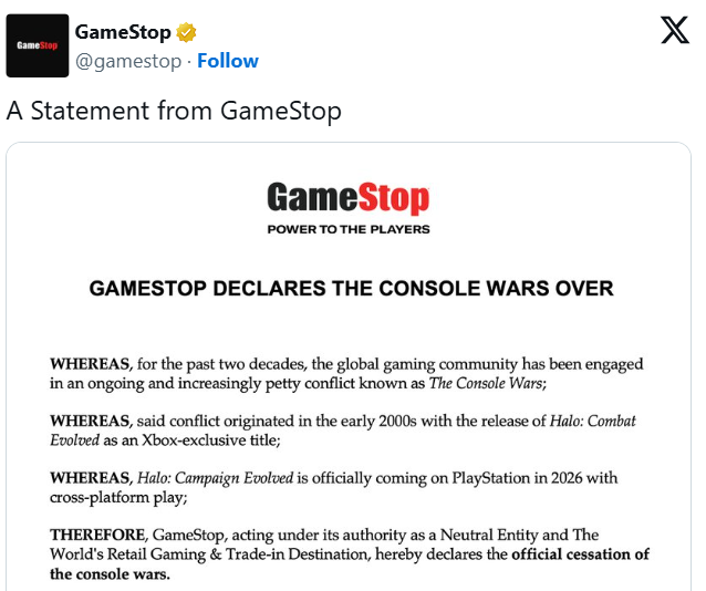 It all started when GameStop (+2%) dropped a post on X announcing the “official cessation of the console wars.” In it, the company called itself a “neutral entity” and demanded that “console loyalists cease hostilities and enjoy this new era of gaming.”