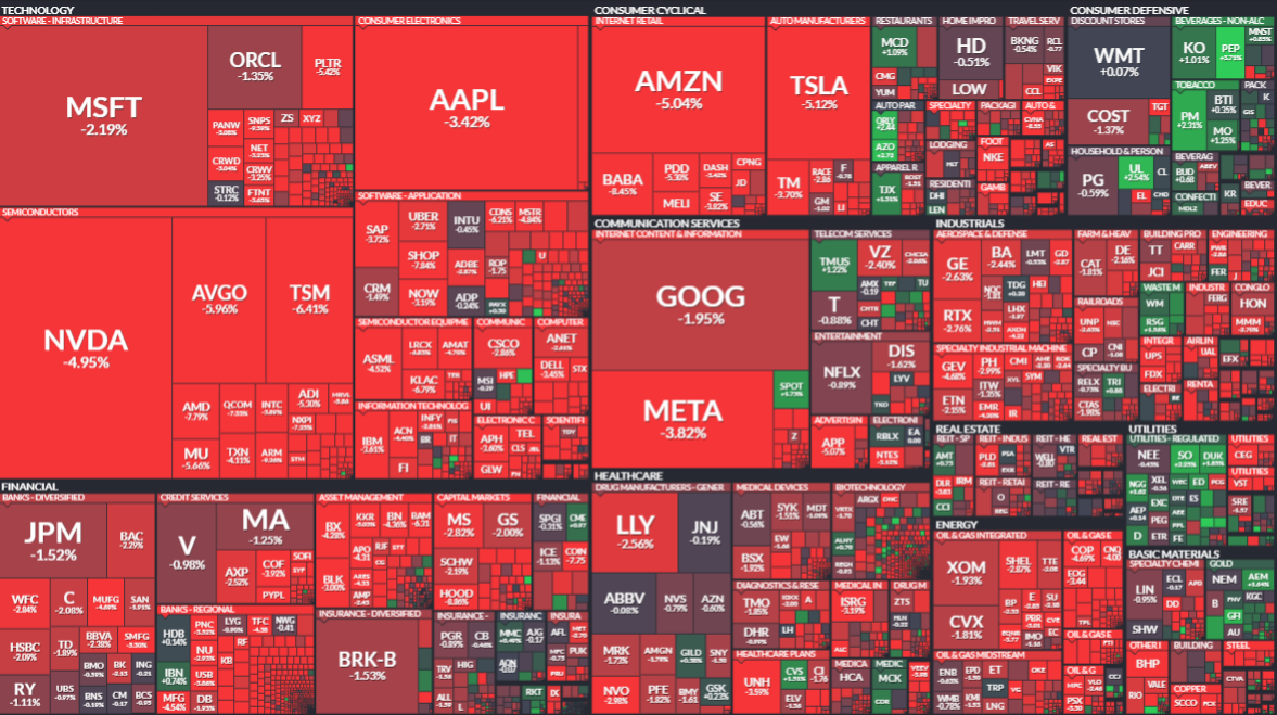 To sum it up: negotiations are dead, tariffs are alive, and investors who spent the week insisting the AI bubble wasn’t real are about to get a masterclass in what “air coming out of the trade” really looks like. The Dow fell 721 points (-1.6%), its worst day since June. The S&P 500 dropped 2.2%, and the Nasdaq got shallacked with a 2.9% loss (flashbacks to March anyone?).