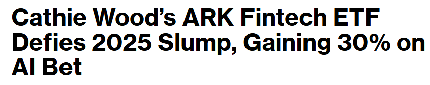 Because while fintech as a category spent 2025 wheezing into a paper bag, Cathie Wood somehow pulled a +29% year out of her ARK Investment Management ARK Blockchain & Fintech Innovation ETF… largely by squinting really hard at the definition of “fintech” and saying “f*** it, close enough.”