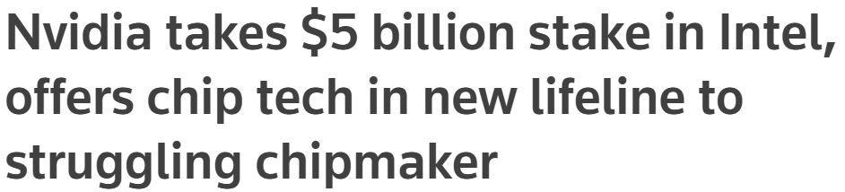It didn’t hurt that Lip Bu Tan (Intel’s CEO) also scored $5 billion from Nvidia, its one-time arch nemesis. The two plan to integrate Intel’s CPUs with Nvidia’s GPUs… because when you can’t beat ‘em, rent your silicon to them.