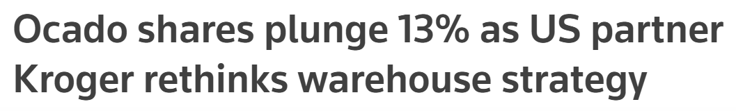 But every earnings report has a subplot, and unfortunately for Ocado, it was the villain in this story. Ocado, the UK-based firm that sells automated warehouse systems, saw its stock tank by as much as 11% after Kroger’s interim CEO Ron Sargent hinted that the partnership might not be as bulletproof as everyone thought. His exact words were: “We are evaluating all options across all facilities to improve profitability.”
