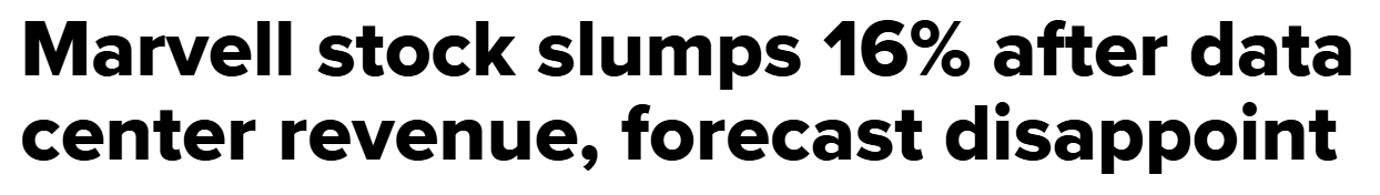 But anyways, let’s look at the earnings report… because the numbers were lowkey good. Revenue hit $2.01 billion, exactly in line with estimates, and EPS squeaked past at $0.67 vs. $0.66 expected. Year-over-year growth was also juicy 58%, mostly thanks to strong demand for custom AI silicon and electro-optics. But Wall Street doesn’t care that your house looks good from the curb if the foundation’s cracked. The minute you throw “AI” into your investor deck, you’re getting graded on a curve that starts at Nvidia and ends somewhere in fantasyland. And when Marvell followed up all that decent growth by saying, “Hey btw, next quarter’s data center revenue is gonna be… flat,” the Street hit the eject button. Hard.
