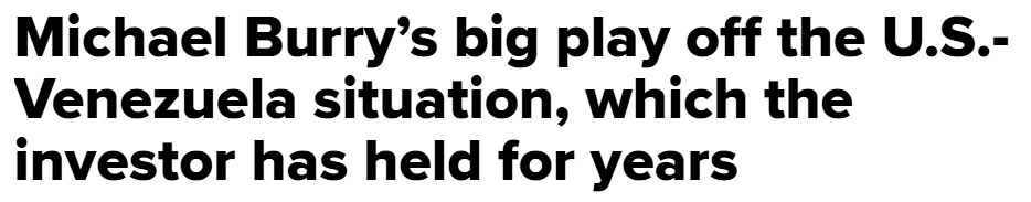 For context, Venezuela has the largest proven oil reserves on Earth… and somehow only produces ~1% of global supply. Well, buckle up f*ckleheads because now that US Special Forces gave Venezuelan leader Nicolás Maduro and his wife the Jet2 holiday treatment… those numbers are about to change. And energy stocks didn’t wait around to ask questions. Chevron ripped. Exxon moved. Valero absolutely sent it. Even the oilfield services names like the true “foreign intervention ETF” caught a bid. And then, right on cue… Michael Burry cleared his throat.