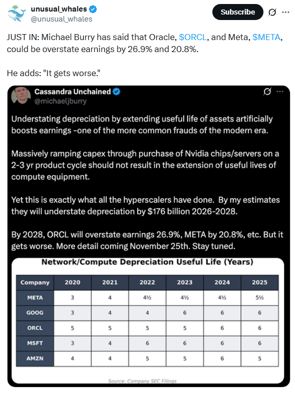 Michael Burry has chosen violence again… this time accusing Big Tech of inflating earnings through what he calls “one of the more common frauds of the modern era.” The man behind The Big Short claims companies like Meta, Oracle, Microsoft, and Amazon are overstating profits by pretending their servers last longer than they actually do. Translation: You can basically smell the faint scent of a bloodbath heading into today’s opening bell (read: Meta and Oracle both down over -1% in pre-market).