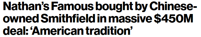 Smithfield Foods has officially backed up the glizzy truck as the Chinese-owned pork empire out of Virginia announced it’s acquiring Nathan’s Famous… in a $450M deal. Why? Because other than blessing us with American Icon, Joey Chestnut… Nathan’s Famous basically owns the Fourth of July. So what better way to imprint the Red Dragon on American soil than to buy the one company that savors the U.S. of A’s two favorite past times: Hot Dogs and Beer.