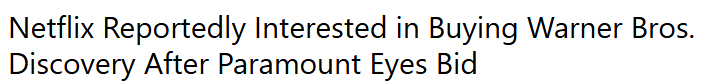In short, on paper, this was supposed to be implausible. Netflix is the disrupter, Warner is old Hollywood, and Ellison is the kid with unlimited daddy funds trying to consolidate studios in the name of “proving” himself to the old man. But once someone drops a live grenade on the M&A table, everyone else starts running their numbers.