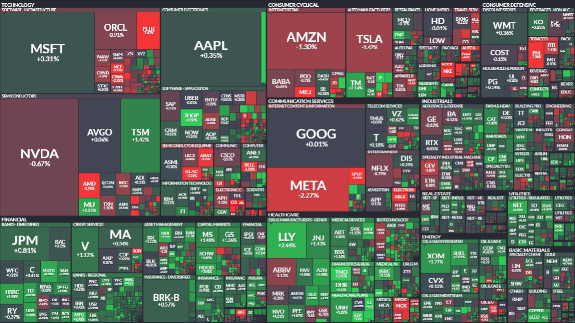 The Dow flirted with 47,000 before easing back, finishing the day up 0.5% at a record close. The S&P 500 barely eked out a gain of 0.1%, good enough for its own all-time high, while the Nasdaq slid 0.3% as Tesla dropped 2.4%.