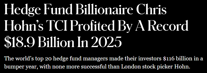 Because while most people assumed Citadel and Ken Griffin would once again be lighting up celebratory stogies and lecturing everyone about discipline, the actual top prize landed with Chris Hohn, who walked away with the biggest single-year profit haul in hedge fund history (yes, bigger than that year).