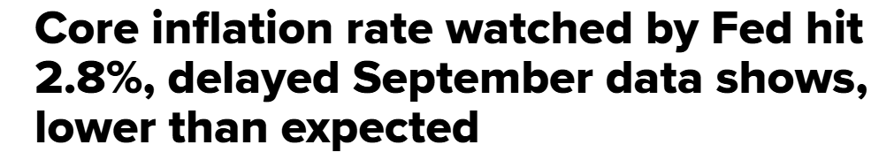 After a full two months late (thanks Congress), the government finally coughed up the September PCE report on Friday… and somehow the market didn’t turn to sh*t because of it. According to the receipts, Core PCE came in at 0.2% for the month, 2.8% year-over-year. Headline: 0.3%, also 2.8%. Bigly.