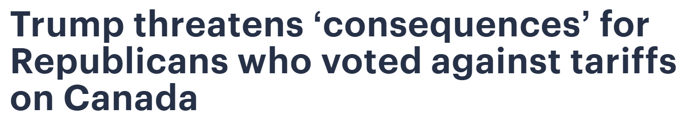 “Any Republican… that votes against TARIFFS will seriously suffer the consequences come Election time,” Trump posted mid-vote. Nothing says healthy intra-party dialogue like Tony-Soprano-level threat, amirite? Obviously this was way more important than maple syrup and auto parts. This was a loyalty exam.