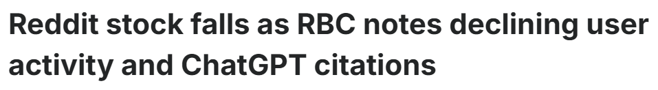 Remember, Reddit already bagged billion-dollar licensing deals with OpenAI and Google. Those contracts are supposed to guarantee its place at the AI table. And in mid-September, Bloomberg reported Reddit was negotiating dynamic pricing with Google… essentially, “pay us more if ChatGPT uses us more.” Investors loved that. The stock went up. But now usage is tanking, which makes “dynamic pricing” about as useful as a horse without legs.