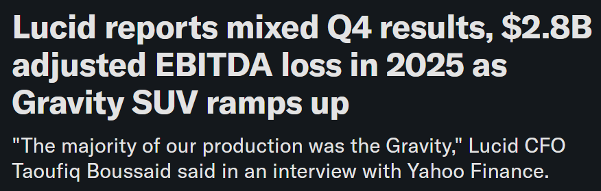 With PIF playing billionaire life support, Lucid finished the year sitting on $4.6B in liquidity and says it’s funded into early 2027. Which again, sounds amazing on paper. Only small issue? They still lost $2.7B in 2025… and managed to flush $814M down the toilet in Q4 alone.
