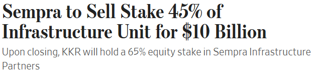 Big news, Sempra just sold off a 45% equity stake of its infrastructure arm (a.k.a. the one with all the sexy assets like Gulf Coast LNG, Mexican gas pipes, and renewables they never really cared about) to KKR and the Canadian retirement mafia for $10 billion. The sale values the whole business at $31.7B, but what it really says is: Sempra doesn’t want to be interesting anymore.