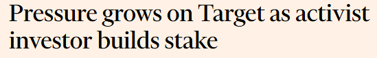 You know that sound when someone jiggles your front door in the middle of the night? That’s just what happened to Target. In short, hedge fund TCIM has officially built a stake in Walmarts “woke” sibling after Target's been doing it’s best impression of a department store stuck in 2019.