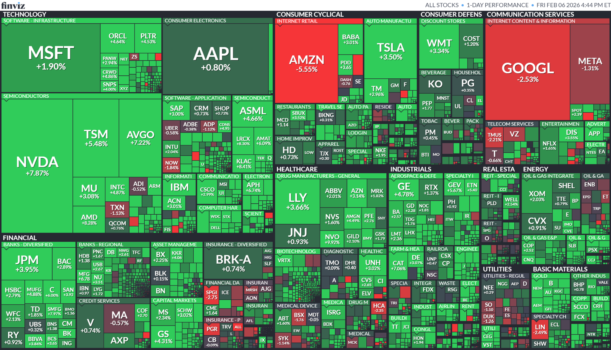 However, not everyone was met with forgiveness. Software, for the most part, stayed pinned to the mat, especially the ones caught in the “AI eats your margins” storyline. Turns out markets can walk and chew gum: bounce the obvious winners, keep side-eyeing the business models that actually look threatened. Meanwhile, while tech was busy rehabbing its reputation, the Dow did Dow things. Old-school, sleep-at-night names quietly printed all-time highs. Coke (+0.66%). Exxon (+2.02%). J&J (+0.93%). Hilton (+1.8%). They all mooned.