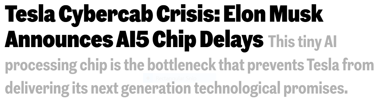 Over the weekend, Tesla dropped yet another episode of When Timelines Attack, and this one might be the season finale. Musk confirmed that Tesla’s next-gen self-driving brain (the hyped, promised, over-sold AI5 chip) “won’t be available in volume until mid-2027.” Not 2025 like he said last year. Not even 2026 with the classic Musk Delay Tax. No, mid-2027. By the time this chip shows up, we might have a new interest rate cycle and the next generation of teenagers will be playing GTA 6.
