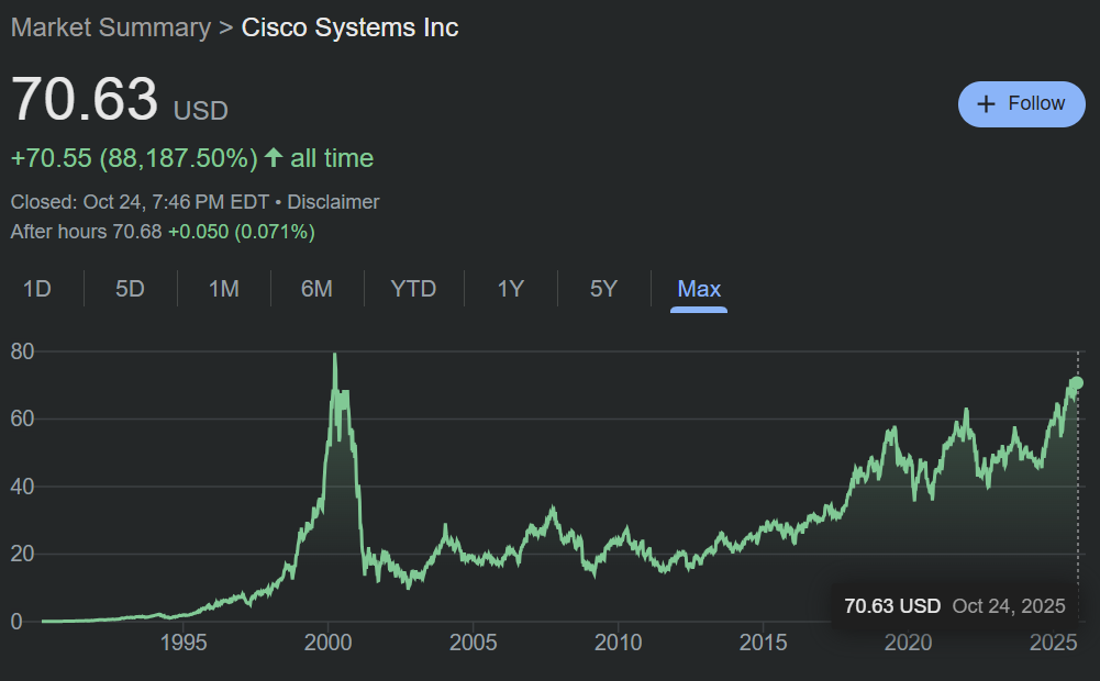 And the thing is, he’s seen this movie before. “This is not my first bubble,” he says. He was around for the dot-com boom when everyone thought Cisco would rule the world forever. Spoiler: Cisco’s stock still hasn’t recovered from the 2000 crash.