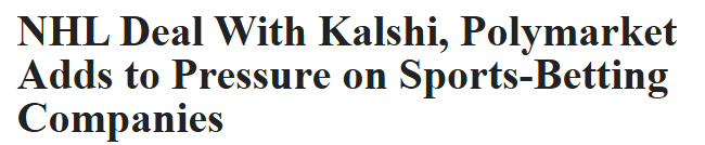 Well it’s official, the GOATS of prediction markets and Gen Z degeneracy are officially taking their talents to the NHL… a partnership that gives both startups the right to use league trademarks (read: teams, logos, even “Stanley Cup”) inside their federally regulated exchanges. Translation: you can now trade the outcome of a hockey game like it’s a soybean futures contract.