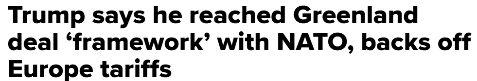After spending the last few days saber-rattling Europe over Greenland the new announcement on the books is that he’s reached a “framework of a future deal” with NATO Secretary General Mark Rutte. Translation: Pour one out for all the poor souls who had a bad case of paper hands on Tuesday.