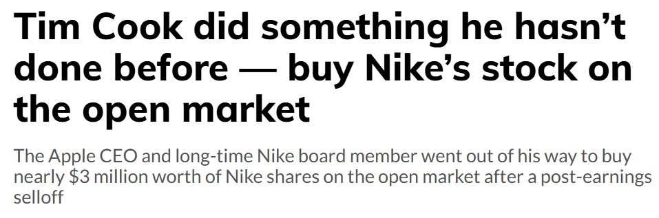 Per a fresh SEC filing, Cook grabbed 50,000 shares at $58.97, nearly doubling his stake. And before you yell “insider trading” into the void… relax. This isn’t some Robinhood revenge trade. Cook’s been on Nike’s board since 2005 and serves as lead independent director. If anyone knows where the bodies, excess inventory, and unsold joggers are buried, it’s him.