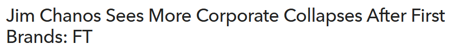 Back in 2020, Jim Chanos (Founder of Kynikos Associates) called it: markets were in the “golden age of fraud.” Fast forward four years and he’s now saying fraud hasn’t slowed… it’s been yeeted higher. Which feels accurate, because two dominoes in consumer credit…Tricolor Holdings and First Brands…just collapsed, and the stench is atrocious.