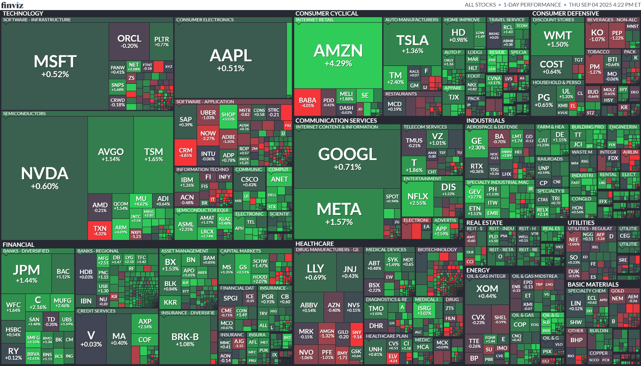 Meanwhile, individual cards were on a heater. Amazon surged +4.2% and dragged the tape higher, while Apple (+0.55%), Meta (+1.57%), and Microsoft (+0.52%) floated just enough to clinch the Nasdaq’s happy ending. Ciena spiked +23.20% on earnings, Gap reinvented itself as a beauty brand (+6%), and Salesforce got knifed -5% for guidance that didn’t live up to the cult.