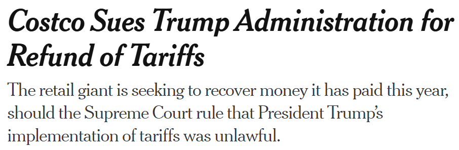 Costco’s latest lawsuit essentially says it paid these tariffs under protest, that even if SCOTUS rules them illegal later they still might not get refunds, and that Customs already told them “lol no” when they asked for more time.