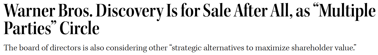 CEO David Zaslav (a man who’s been on a Dave Ramsey bender all year) confirmed the company is expanding its “strategic review.” Which in Lawyereze means: We’re not saying we’re for sale… but like, if Netflix (or David) wants to take us out to Ruth’s Chris, we’ll hear them out.