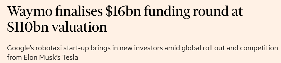 According to people familiar with the deal (translation: folks who’ve actually seen the cap table), Waymo is finalizing a $16 billion funding round that pegs the self-driving unit at a $110 billion valuation. That’s more than double where it was last year… and yes, that sound you hear is every “robotaxis are 10 years away” take getting reverse over the curb.