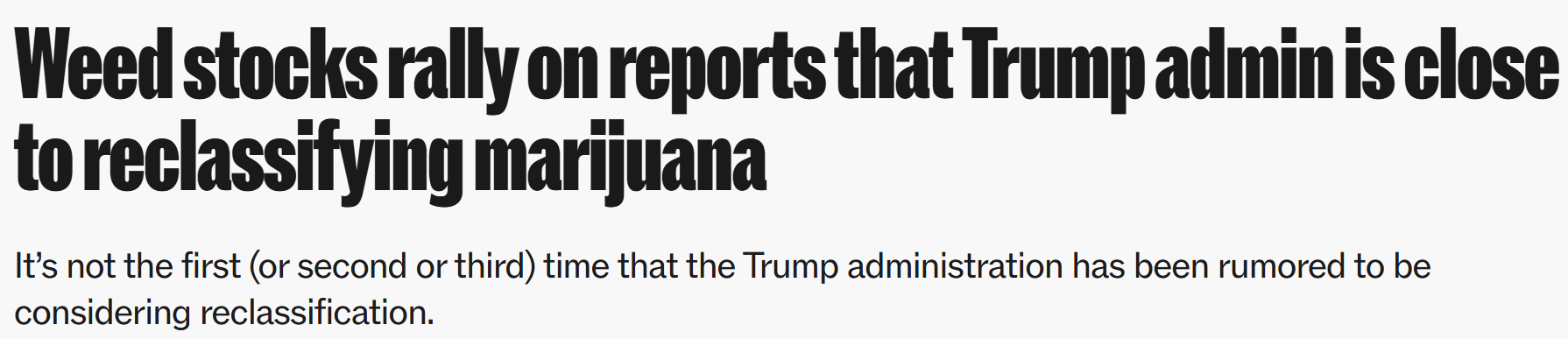 Sure, Trump has teased this in the past. But markets have the memory of a goldfish. This report was enough. Weed rescheduling was always a matter of timing… and now the timing feels… imminent-ish.